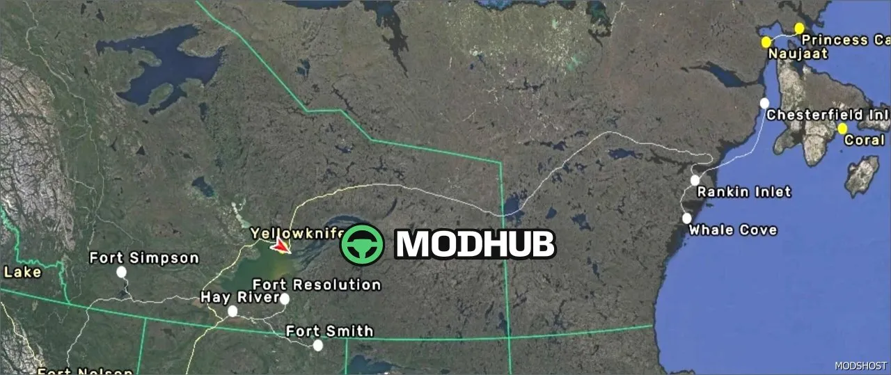 Road to Nunavut is a mod that connects Yellowknife (NWT) to Rankin Inlet (Nunavut) and is the only road going into the territory, connecting it to the rest of mainland Canada.