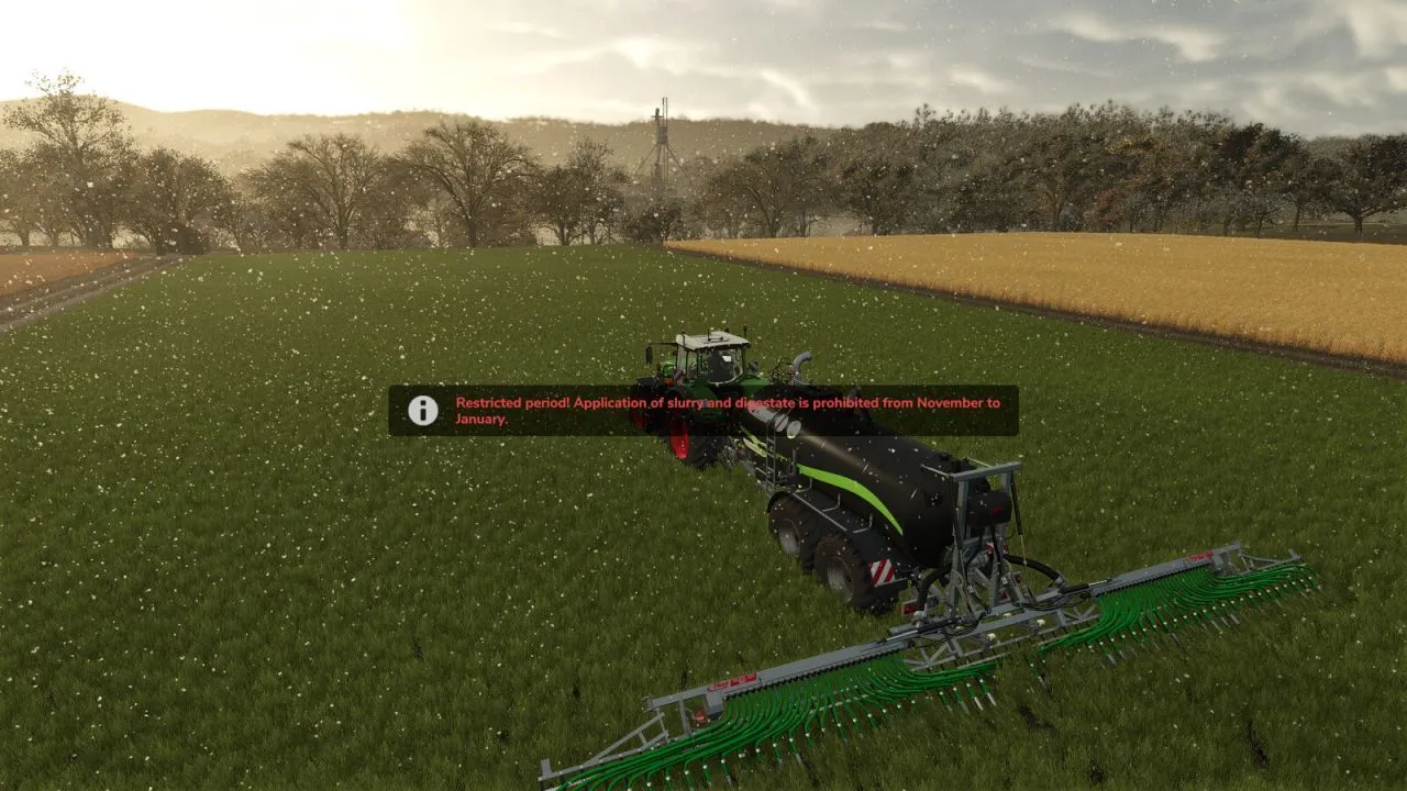 Цей мод впроваджує реалістичні обмежені періоди для застосування органічних добрив (гній, рідкі добрива), спираючись на реальні норми використання добрив. У ці періоди активність техніки автоматично блокується. ✅